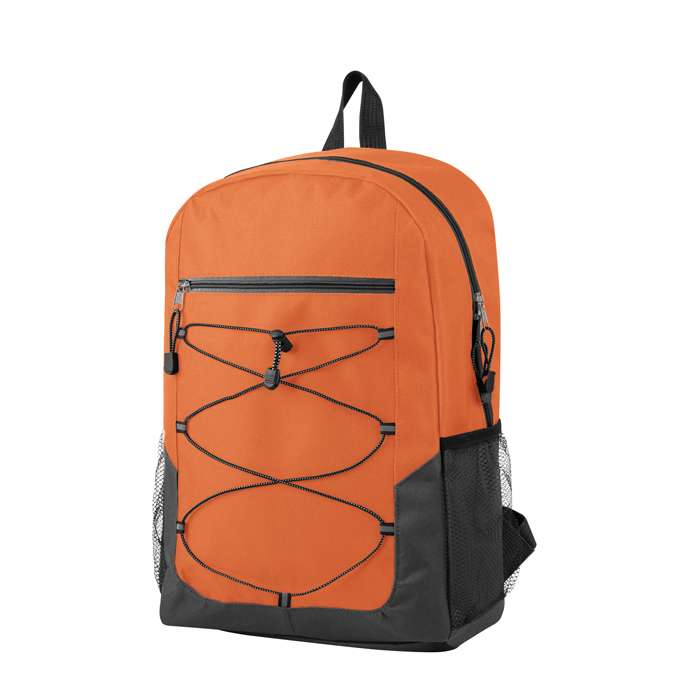 zaino in poliestere 600D ; vano interno imbottito ; tasca frontale con zip ; tasche laterali in materiale traforato ; elastici stringenti frontali ; spallacci imbottiti e regolabili