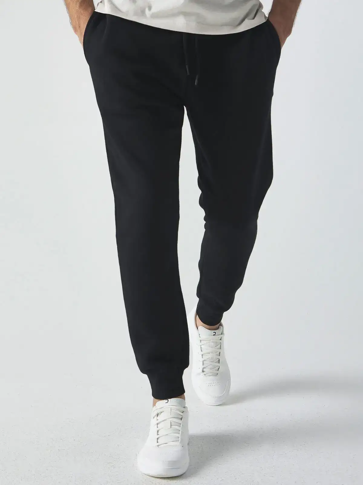 70% cotone pettinato, 30% poliestere. Tessuto interno in poliestere ed esterno 100% cotone. Pantaloni felpati internamente, tasche a filetto dello stesso tessuto, tasca posteriore con toppa, cordoncino in tinta con estremità in plastica. Etichetta strappabile.