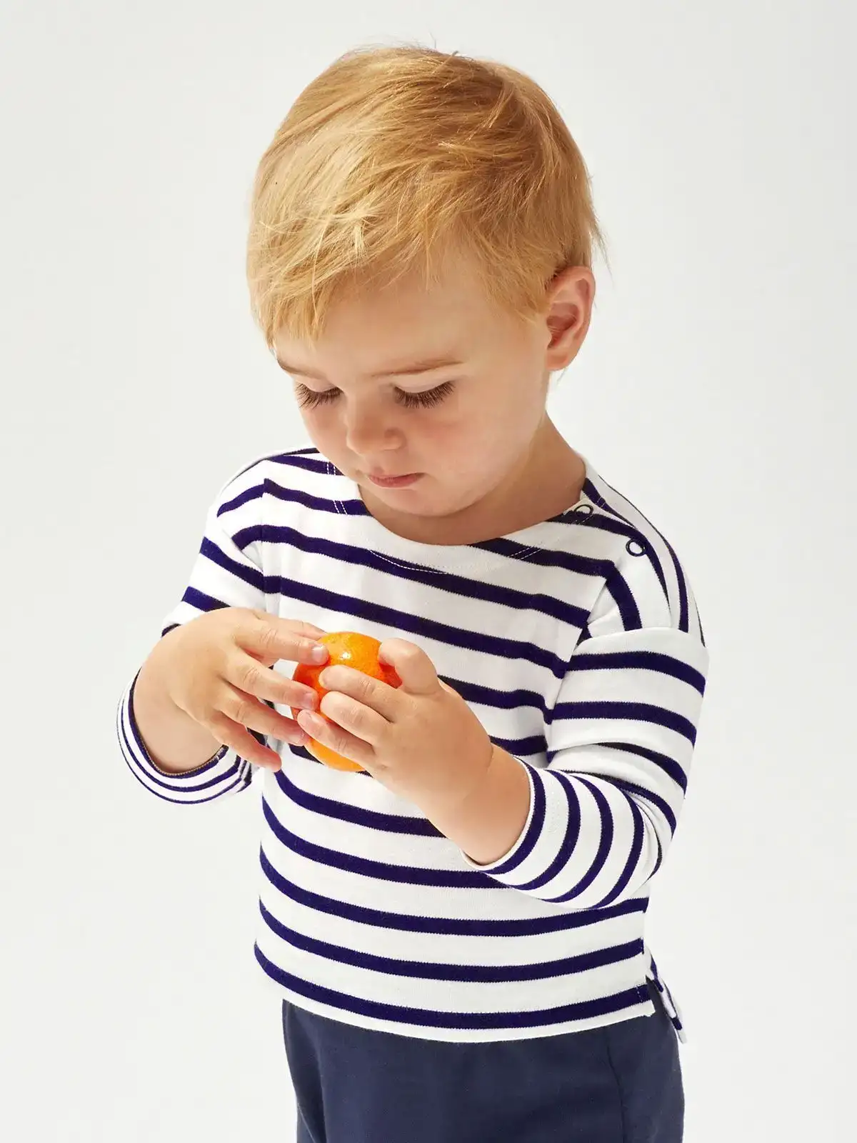 100% Cotone Organico interlock. Maglia baby a maniche lunghe, spacchi laterali, più lunga sul retro, stampa a righe tinta in filo, etichetta strappabile.