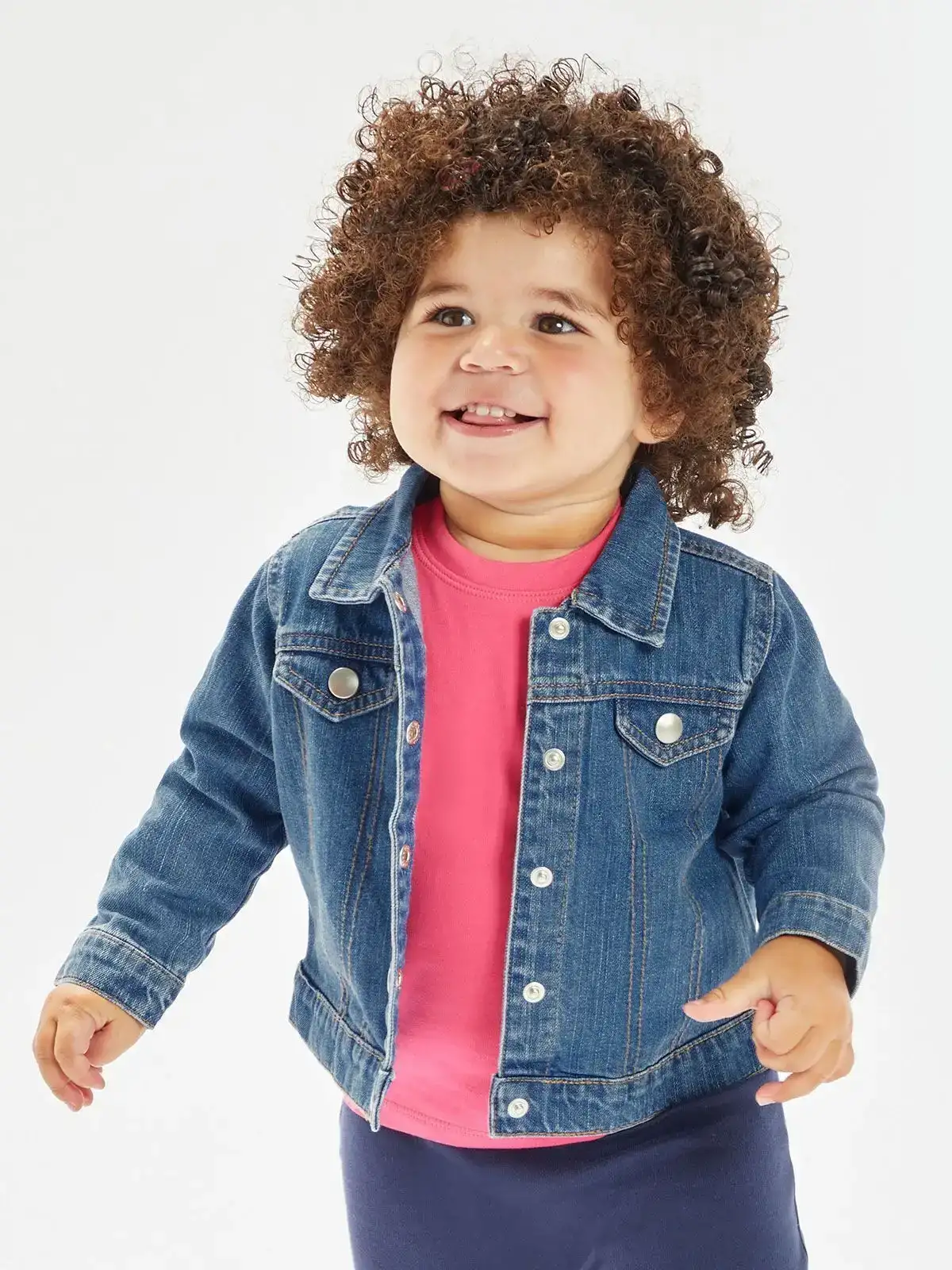 100% cotone organico OCS. Giacca bimbo in denim con due tasche sul petto con bottone a pressione, cuciture in jeans, tessuto liscio per facilitare la decorazione, polsini con chiusura a bottoni, etichetta a strappo.