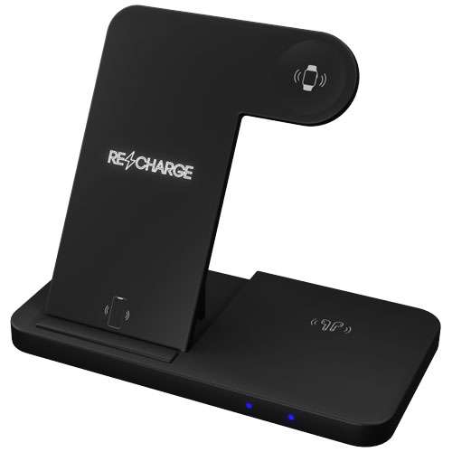 Base wireless pieghevole 3 in 1 realizzata in plastica riciclata, che funziona anche come supporto per telefono. La base può ricaricare tre diversi dispositivi contemporaneamente: smartphone (15 W), auricolari (5 W) e smartwatch (2 W). Fornita in una confezione regalo (19 x 17,5 x 2,3 cm) con chiusura magnetica. Garanzia di 3 anni inclusa.