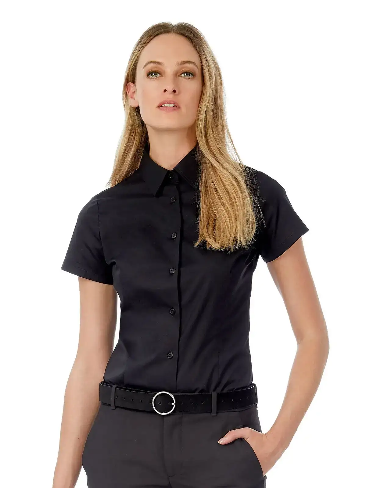 97% cotone pettinato e 3% elastane. Camicia in popeline elegante con colletto dal taglio femminile, leggermente sfiancata ai lati. Orlo sul bordo delle maniche. Bottoni tono su tono cuciti a croce con effetto madreperla. Chiusura orizzontale sull'ultimo bottone. Un bottone di riserva.