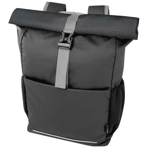 Borsa per bicicletta impermeabile con chiusura roll-top realizzata con materiali riciclati certificati GRS. Presenta uno scomparto imbottito per portatile da 15", diverse tasche con funzionalità organizzative, una chiusura a strappo regolabile per montarla facilmente su diversi tipi di biciclette e bordini catarifrangenti per maggiore visibilità. I materiali riciclati certificati GRS includono il tessuto principale, la fodera, la cinghia e le cerniere. Capacità: 20 litri. Senza PVC.