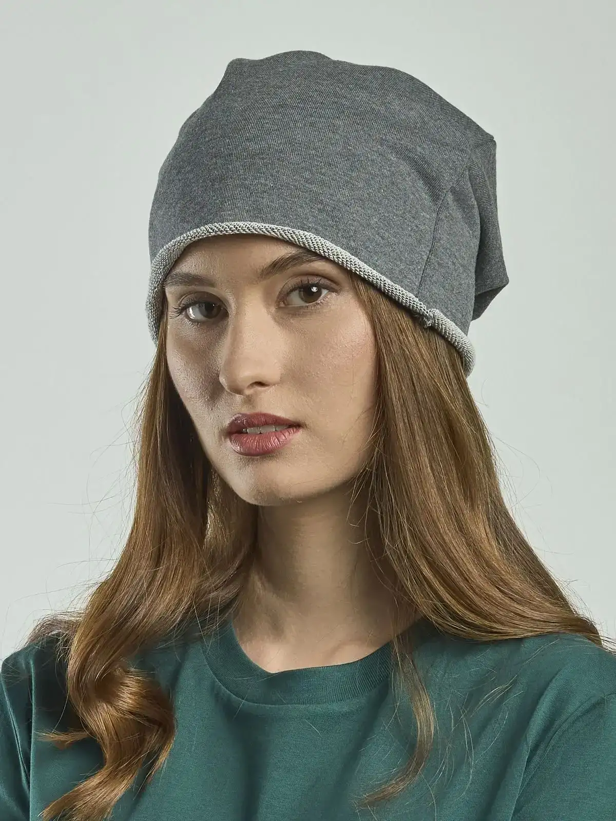 60% cotone 40% poliestere. Cuffia con orlo a taglio vivo e 6 cuciture di chiusura. Lunghezza oversize: 30 cm. Taglia unica. Etichetta removibile.