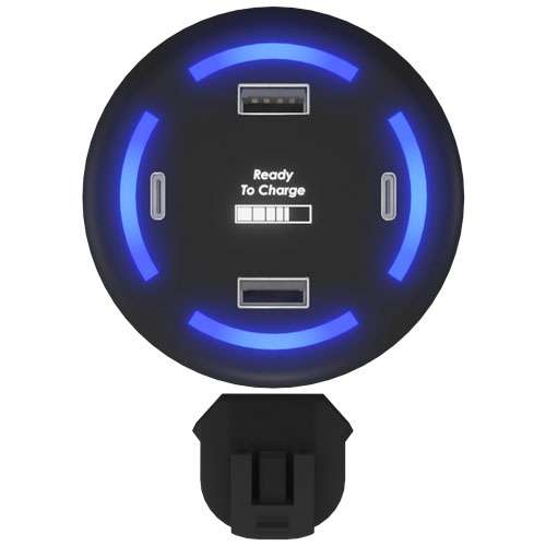 Caricabatterie smart home da 4,2 A con finitura in gomma soft-touch e logo luminoso. Grazie alle porte da 5 V/2,4 A, è possibile caricare fino a 4 dispositivi contemporaneamente. Il caricabatterie è dotato di uscite USB e USB Tipo C da 2,4 A. Ogni porta presenta un indicatore luminoso blu che si illumina quando un dispositivo viene ricaricato. Una volta che il dispositivo è completamente carico, l'indicatore si spegne per risparmiare energia. Prese di corrente UE e USA incluse. Con confezione regalo in carta kraft riciclata (9,8 x 12,3 x 5,3 cm). Garanzia di 3 anni inclusa.