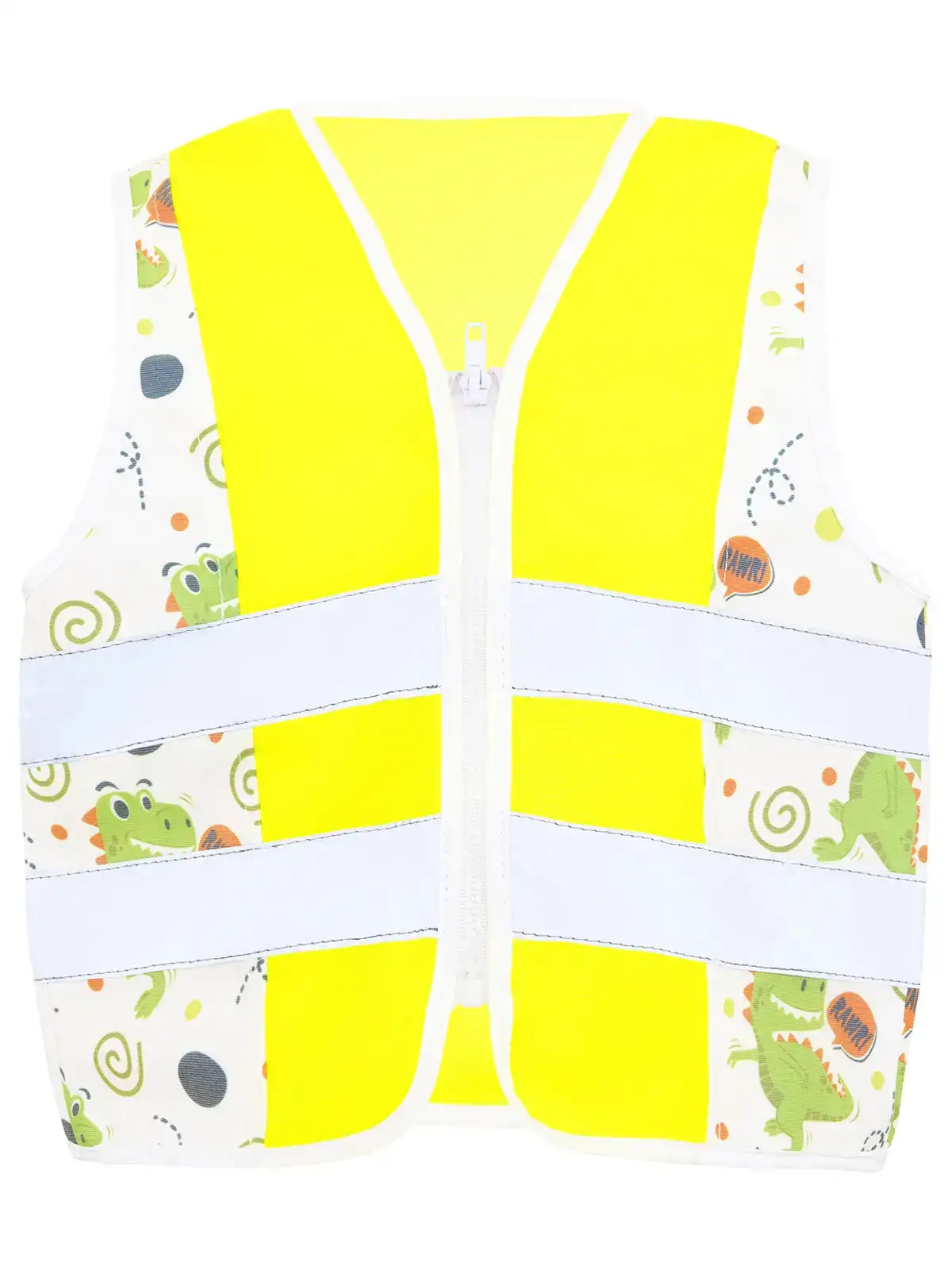 100% poliestere. Gilet ad alta visibilità per bambini con disegni di dinosauri, alta visibilità grazie al tessuto leggero a fantasia con rivestimento riflettente e strisce riflettenti, chiusura con pratica cerniera. certificato secondo la norma EN 17353