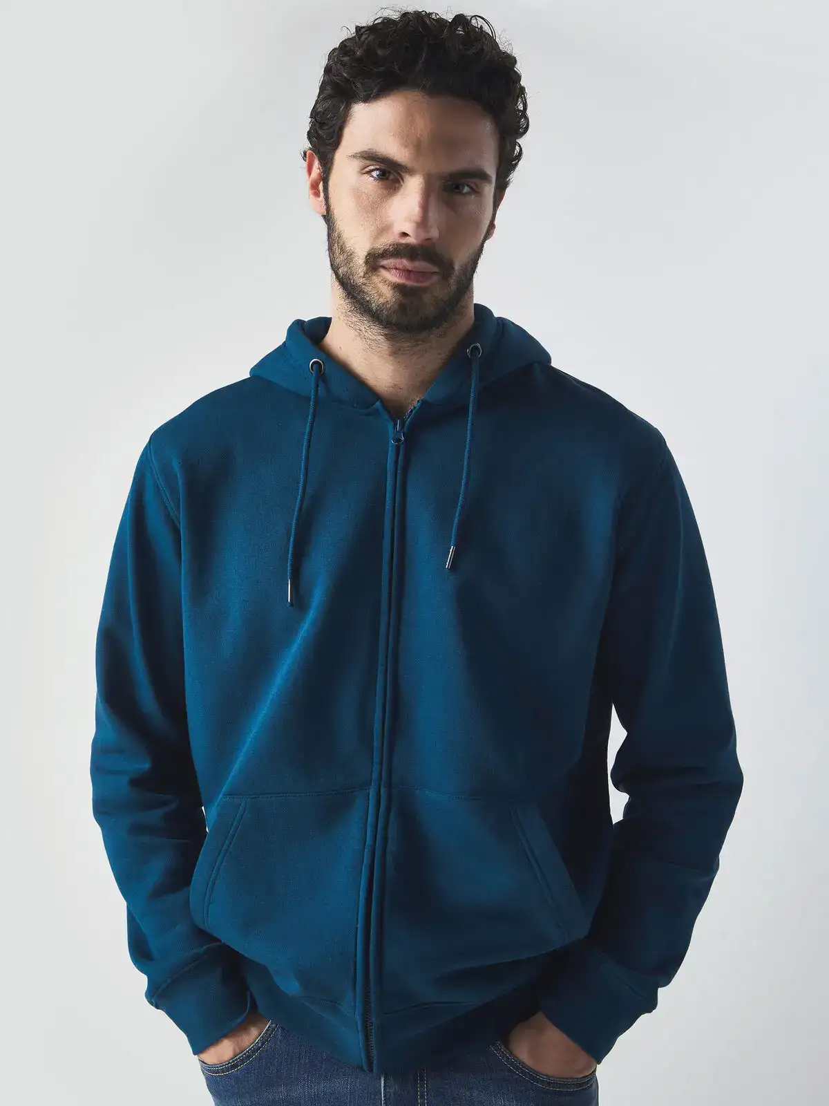 80% cotone organico, 20% poliestere riciclato. Felpa con cappuccio a doppio strato, genderless, morbido tessuto ecosostenibile trattato ad enzimi, cerniera tono su tono coperta, occhielli in metallo, cordini con punta in metallo, maniche set-in, tasca a marsupio, struttura con cuciture laterali, fascia in vita e polsini in costina. Felpata internamente in poliestere ed esterno 100% cotone per una migliore stampabilità. Etichetta taglia tessuta al collo ed etichetta laterale strappabile con logo, composizione e istruzioni di lavaggio.