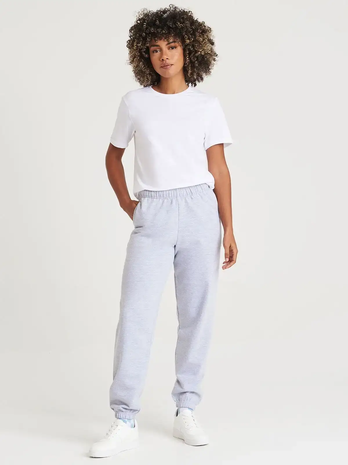 80% cotone ringspun, 20% poliestere. Pantaloni felpati internamente con polsini, cordini interni, tasche laterali, etichetta strappabile. (Col. HGR: 75% cot. 25% pol.)