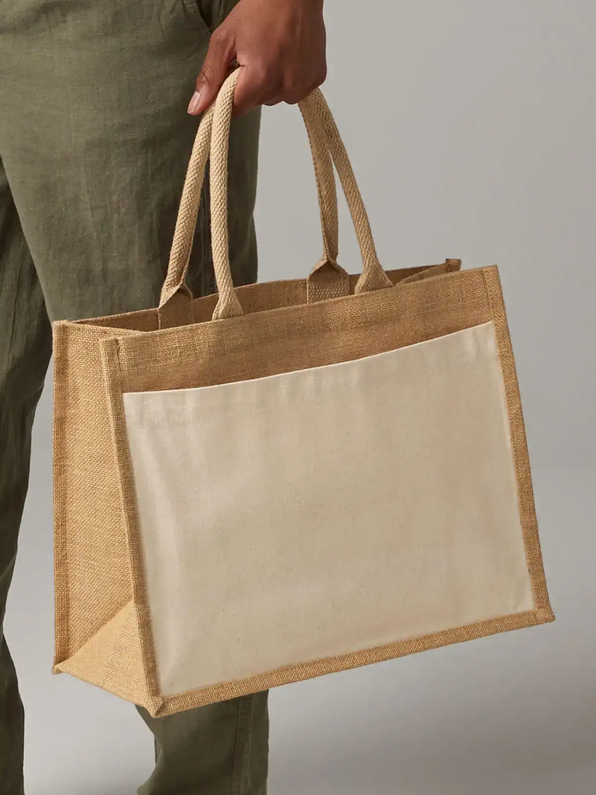 100% juta laminata. Shopper multiuso in Juta laminata con tasca frontale in tela 100% cotone. Etichetta removibile. Dimensioni: 42 x 33 x 19 cm, lunghezza manici: 55 cm, capacita': 21 litri, area stampabile: 36 x 22 cm.
