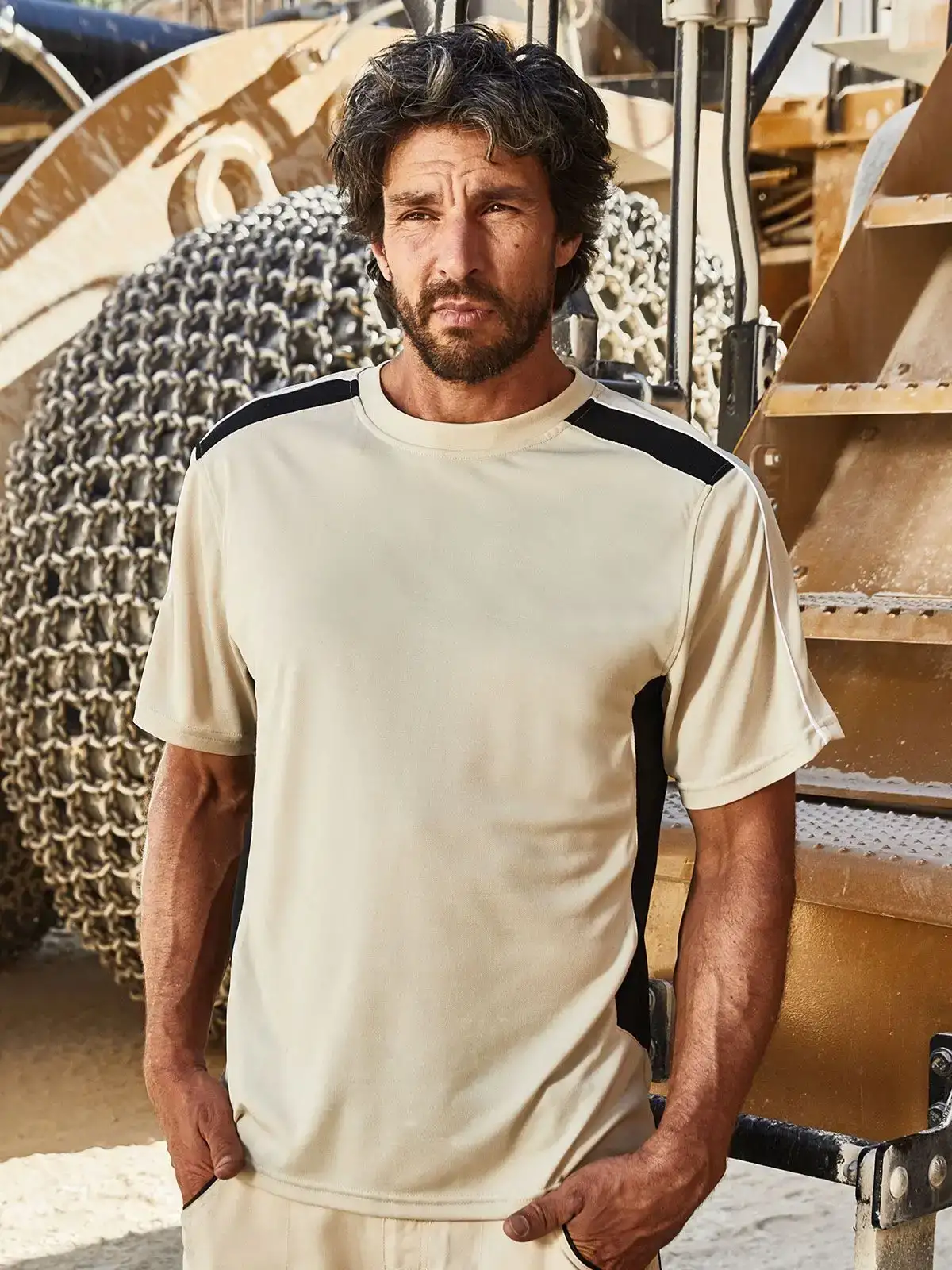 100% poliestere. T-shirt girocollo, manica corta set-in, funzionale, traspirante e leggera. Inserti di colore contrastante su spalle e maniche. Struttura con cuciture laterali.