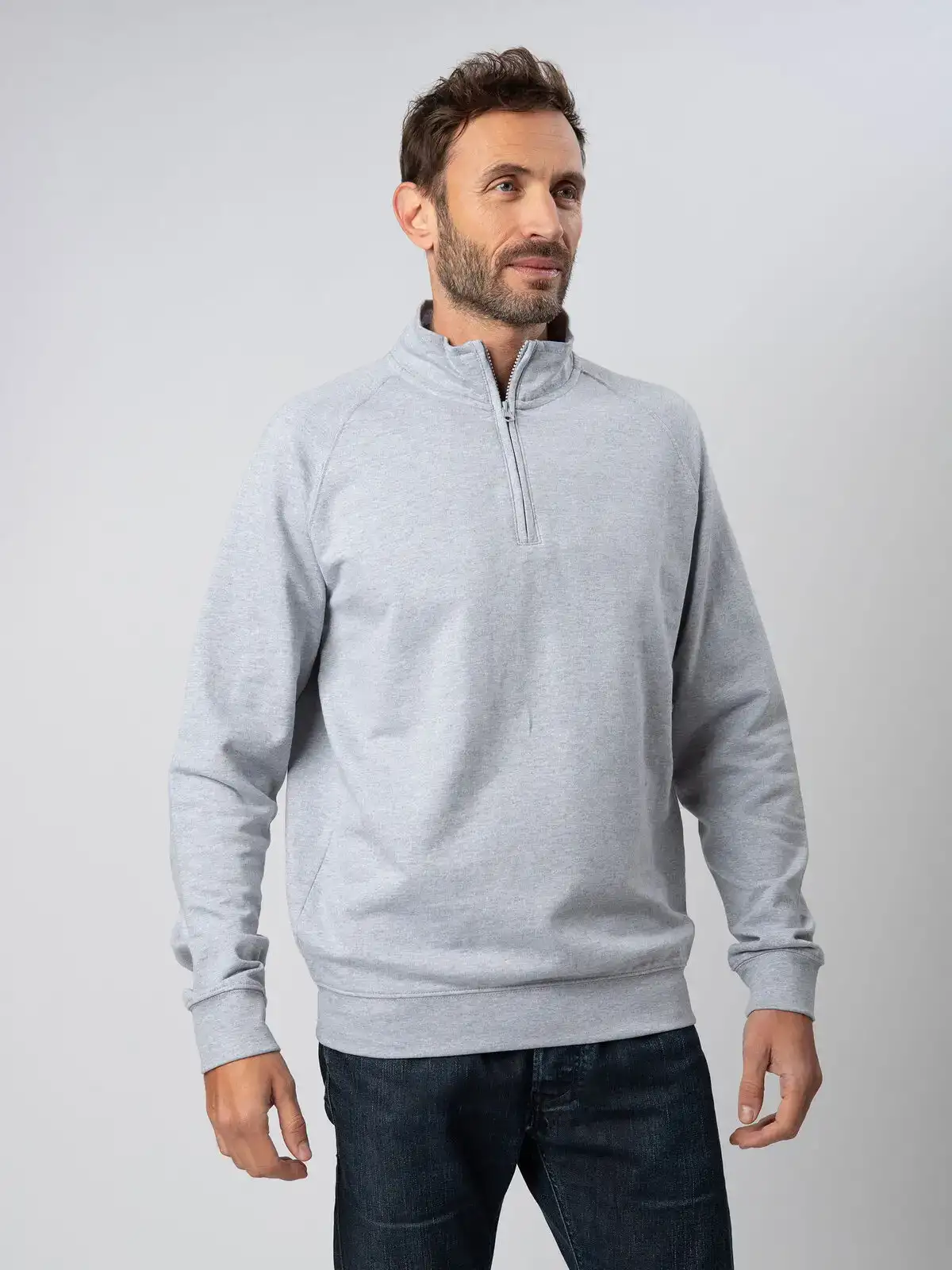 80% cotone, 20% poliestere. Felpa french terry con mezza zip, maniche raglan, collo alto. Orlo inferiore e polsini in costina, struttura con cuciture laterali. Etichetta strappabile. Parte esterna: 100% cotone, parte interna: 50% cotone, 50% poliestere.