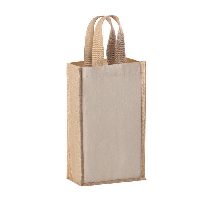 borsa porta bottiglia in cotone e juta laminata ; manici corti ; soffietto ; 220 g/m2