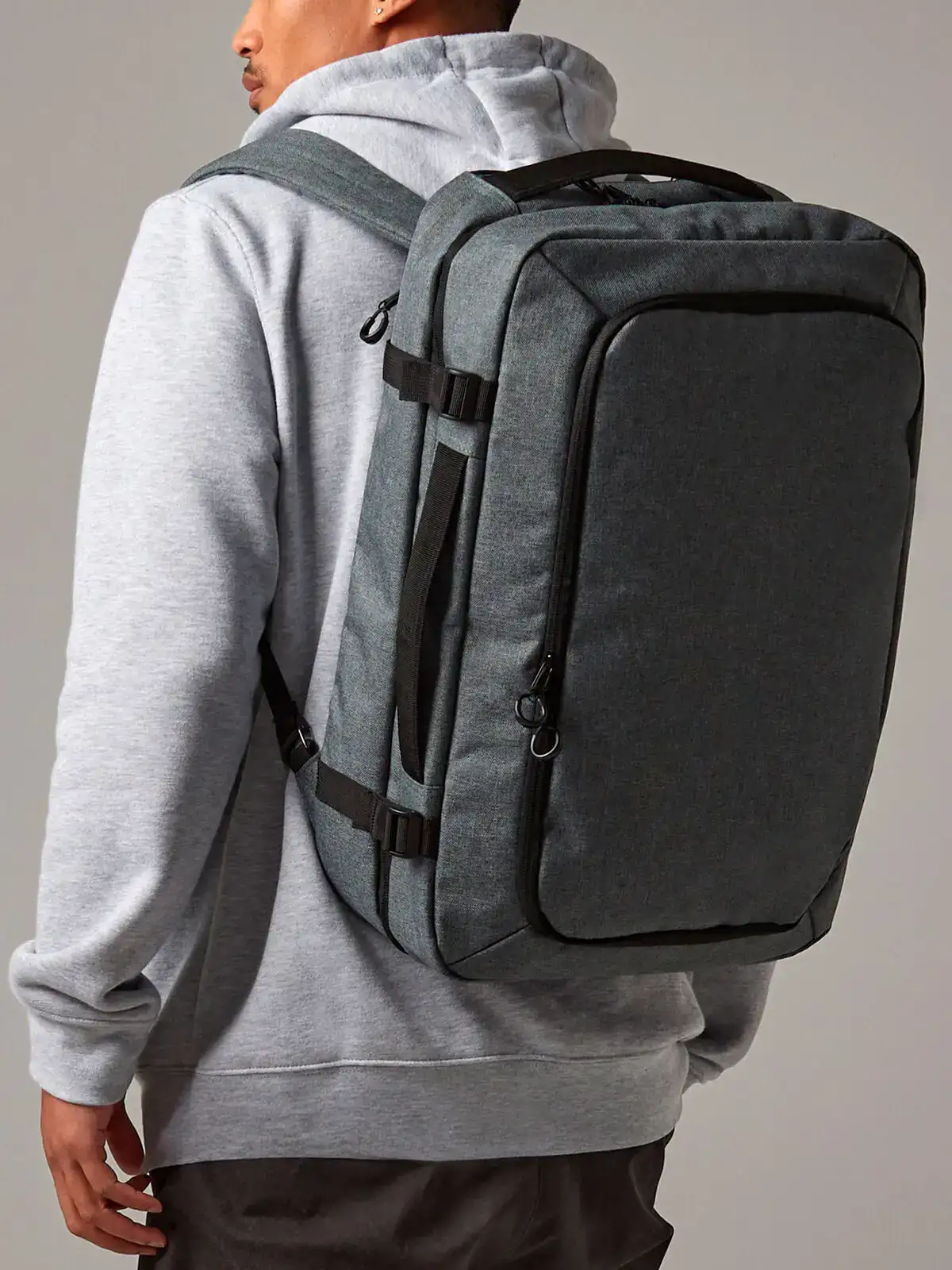100% Pol. 600D. Zaino con scomparto imbottito per laptop (15,6"), cerniera dello scomparto principale con chiusura con blocco. Tasca superiore con cerniera, scomparto frontale con cerniera e divider interno in rete, tasca interna con zip, cinghie a doppia compressione, borsa con tracolla a scomparsa. Idoneo per la maggior parte delle compagnie aeree. Etichetta TearAway. Dimensioni: 35 x 51 x 28 cm. Chiuso: 35x51x20 cm. Capacità: 40 litri. Area di stampa: 22x36 cm.