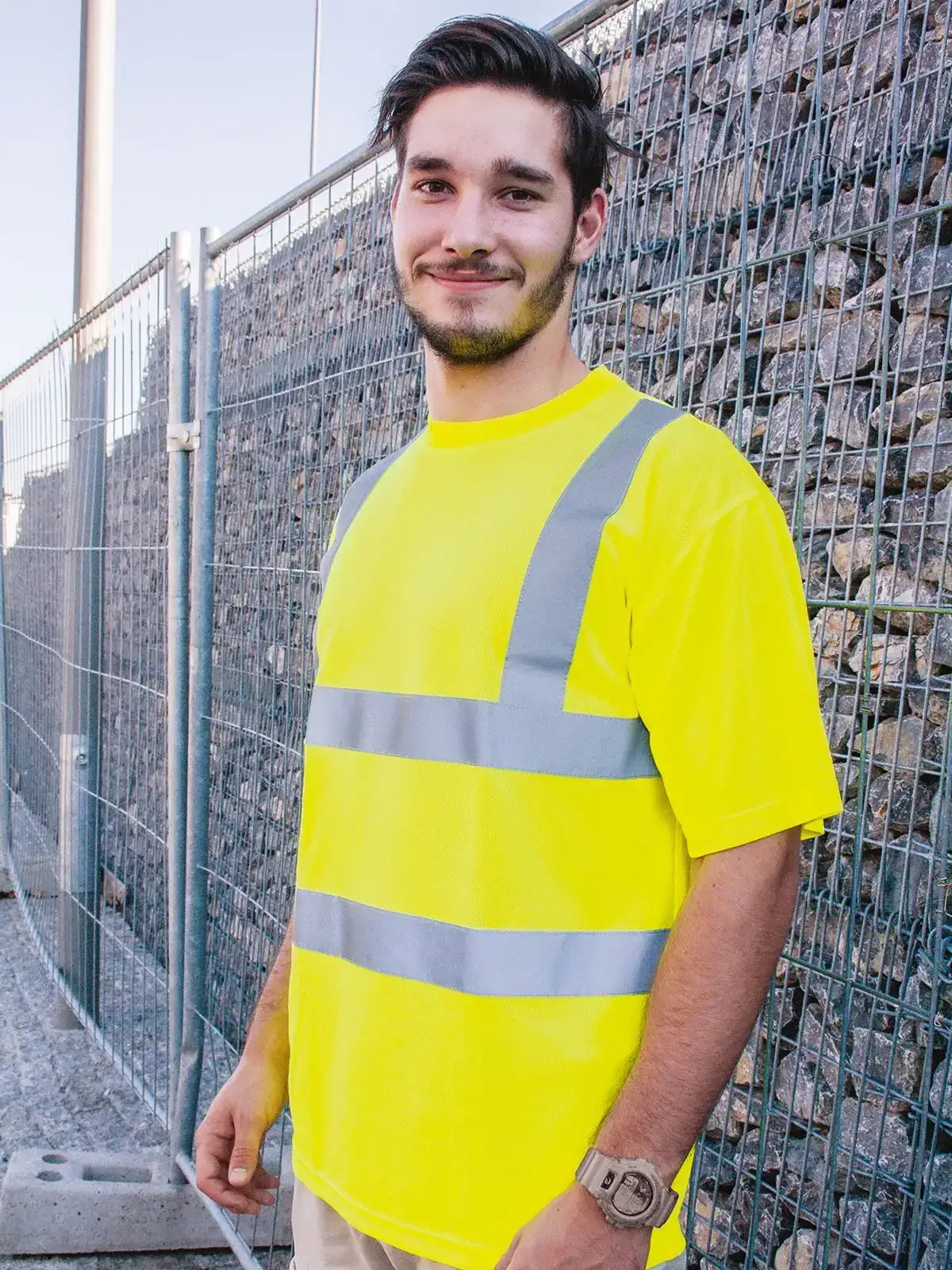 100% poliestere. T-Shirt ad alta visibilità, certificazione EN ISO 20471:2013 + A1:2016, colore arancione conforme anche alla normativa GO/RT 3279, Oeko-Tex® Standard 100. Due fasce riflettenti larghe 5 cm intorno al corpo, due fasce riflettenti larghe 5 cm perpendicolari alle spalle, materiale morbido e traspirante, durata delle proprietà riflettenti in conformità alla normativa EN per 25 cicli di lavaggio a 40°C. Confezionata singolarmente in una pratica borsa in polietilene.