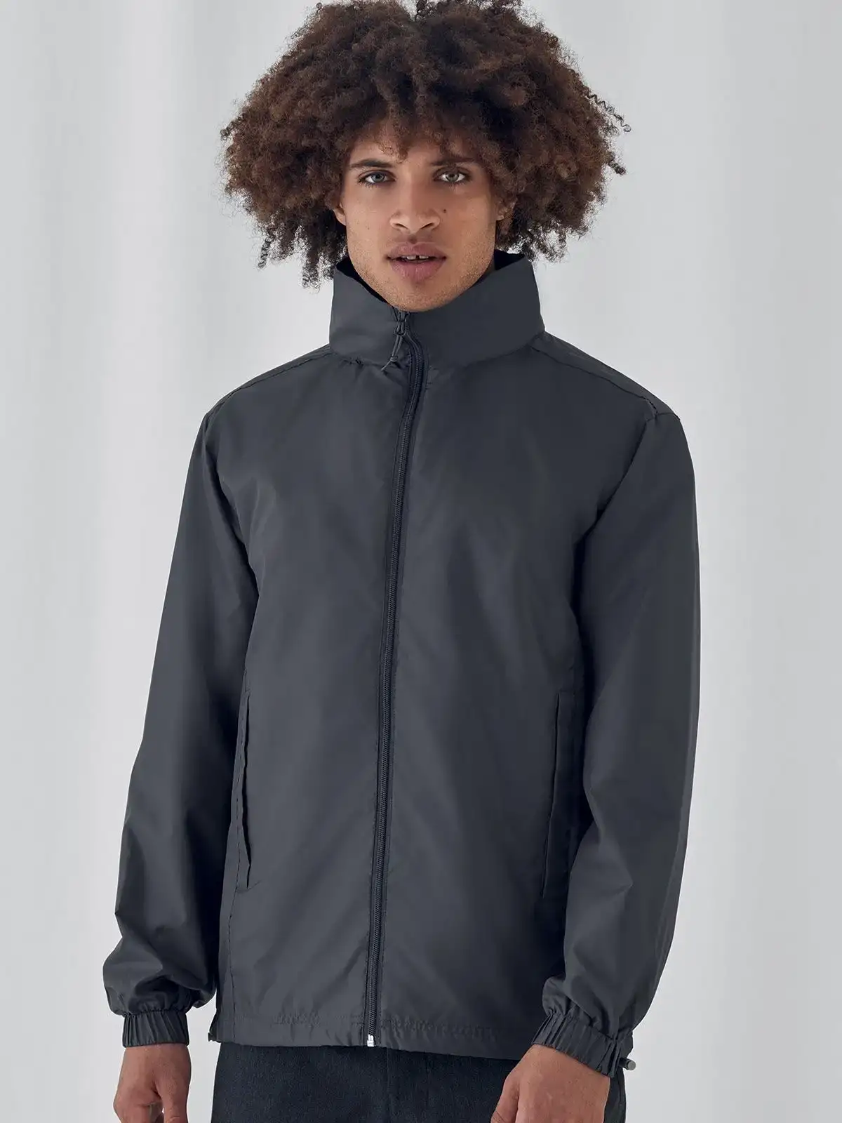 100% poliestere . Giacca antivento e antipioggia, termoisolante e idrorepellente, esterno poliestere 210T taffetà, interno 100% poliestere tricot. Cappuccio ergonomico a scomparsa, due tasche frontali e taschino interno.