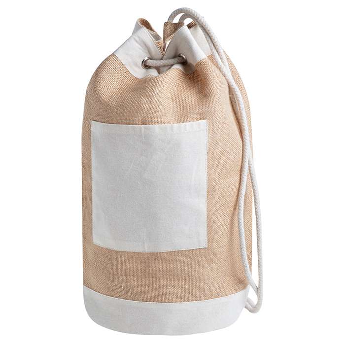 sacca zaino juta e cotone ; tasca frontale in cotone ; chiusura con corda ; Tecnica di stampa consigliata: Serigrafia - Transfer