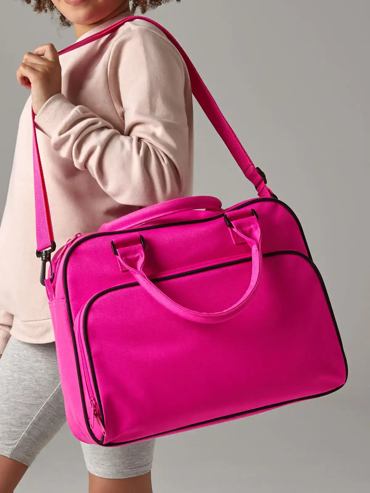 100% poliestere 600d. Borsa con doppio manico e lunga tracolla regolabile. Tasca frontale con zip e piccola tasca retata interna. Etichetta removibile. Dimensioni: 39 x 29 x 16 cm, capacita': 15 litri, area di stampa: 30 x 15 cm.