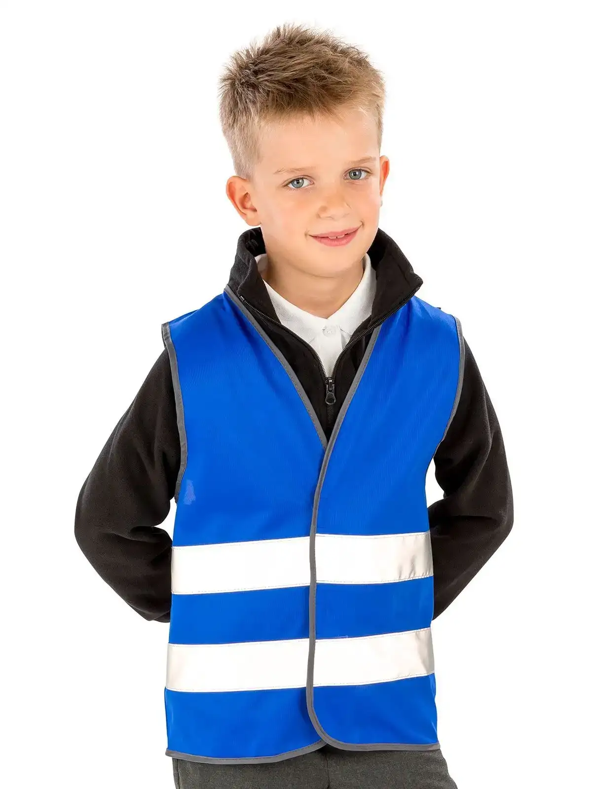100% poliestere. Gilet ad alta visibilita' per bambini, strisce di sicurezza cucite (50 mm), orli di colore grigio, chiusura a strappo