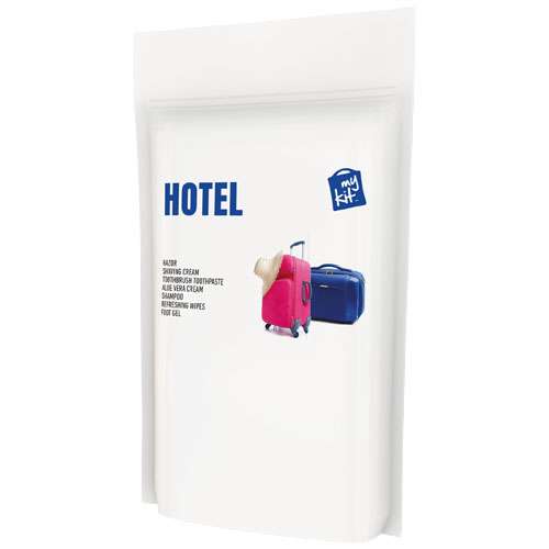 Kit di cortesia per hotel con tutto il necessario per gli spostamenti. Ideale per viaggi di lavoro, fiere o congressi. Contenuto: 1 rasoio, 1 gel da barba, 1 crema all'aloe vera, 1 shampoo, 1 gel per piedi, 1 lima per unghie, 1 spazzolino e 1 dentifricio. Tutti i prodotti del kit per il pronto soccorso e per la cura del corpo sono conformi a tutte le normative UE vigenti. Prezzo incluso della stampa a colori. Forniti in una confezione di carta.