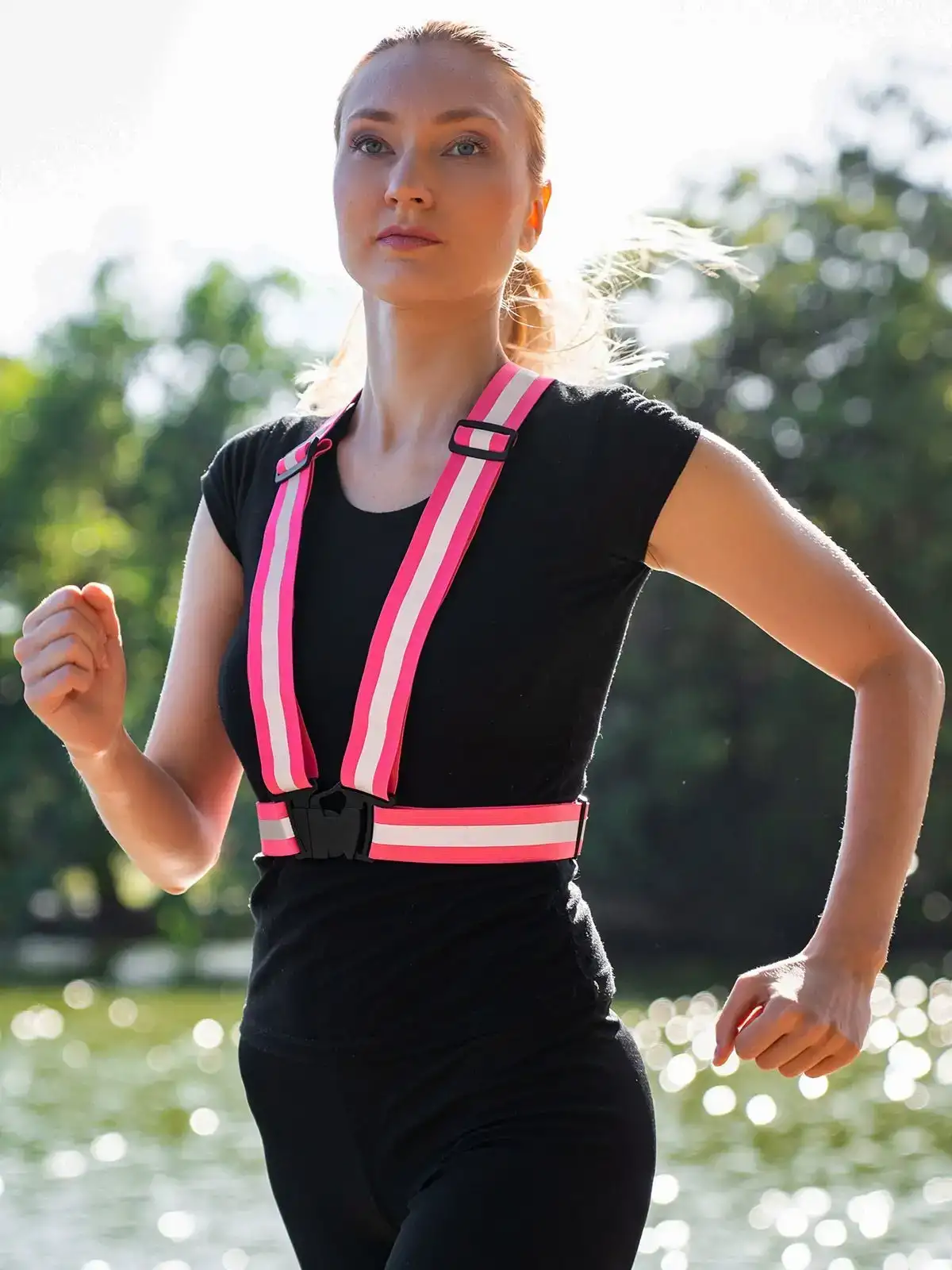 100% poliestere. Imbragatura da petto riflettente ed elastica, per attività all'aperto: jogging, trekking, ciclismo. Taglia regolabile sul busto, chiusura a clip sul davanti.