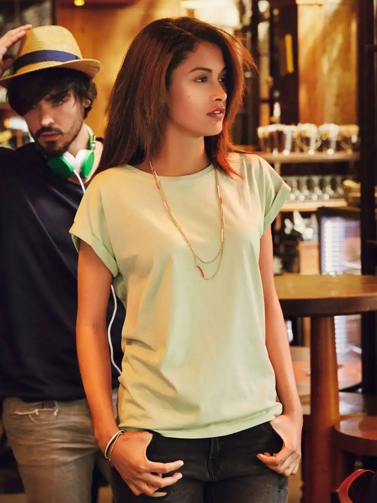 100% cotone organico. single jersey. T-shirt manica corta, girocollo profondo. Giromaniche arrotolate con elastane, etichetta strappabile, struttura con cuciture laterali.