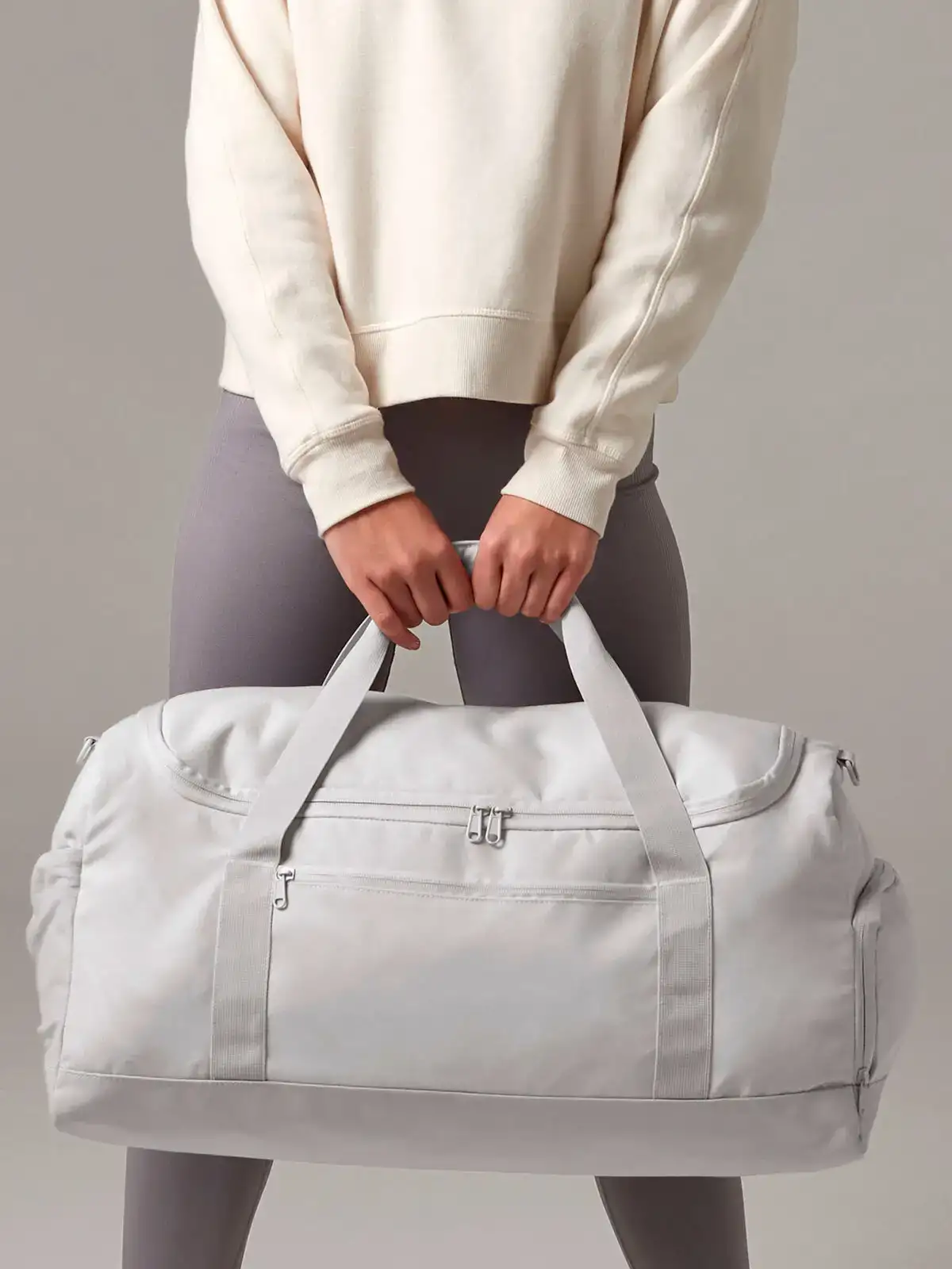100% poliestere riciclato. Borsone in poliestere riciclato certificato GRS, pannello base rivestito in PU, apertura con due zip bidirezionali, scomparto porta scarpe, tasca frontale con zip, tasca esterna a rete, tasca interna a rete, maniglia imbottita, tracolla regolabile e removibile. Dimensioni: 55x26x27cm, Capacità: 35 litri, Area di stampa frontale: 12x25 cm massimo, superiore: 40x24cm. Etichetta strappabile.