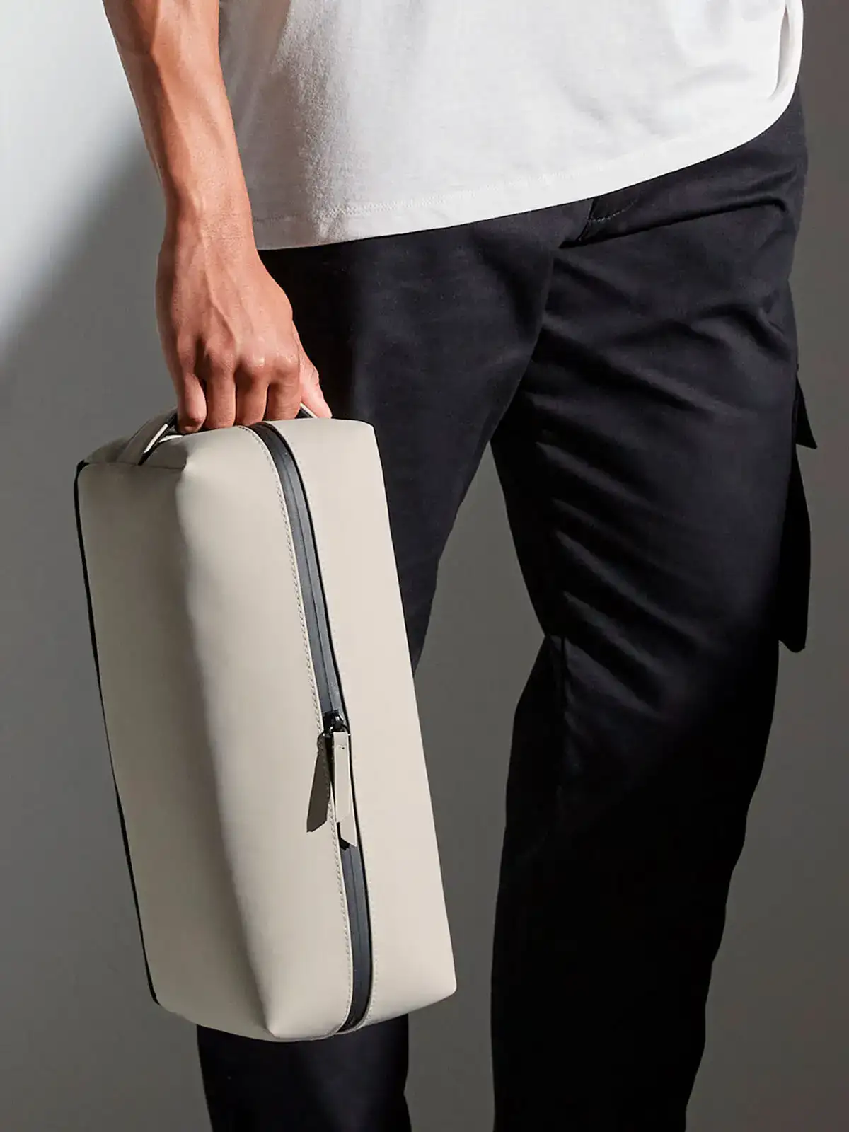 100% poliestere riciclato con rivestimento opaco in poliuretano. Senza PVC. Borsa porta scarpe e accessori dallo stile minimalista, in tessuto idrorepellente, multiuso, scomparto principale con zip extra lunga, manico laterale, etichetta removibile. Dimensioni: 35 x 13 x 18 cm. Capacità: 8 litri.