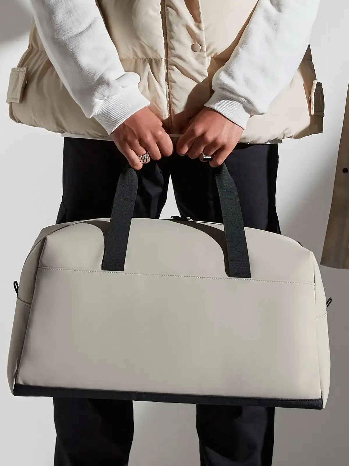 100% poliestere riciclato con rivestimento opaco in poliuretano. Senza PVC. Borsone in tessuto idrorepellente, in stile minamalista, con scomparto principale extra lungo con cerniera, tasca interna con cerniera, pannello di fondo a doppio strato per una maggiore resistenza, manici in fettuccia, involucro porta manici in tessuto, può essere portato a mano o a tracolla, etichetta removibile per cambiare più facilmente il marchio. Dimensioni: 53 x 24 x 27 cm. Capacita': 28 litri.