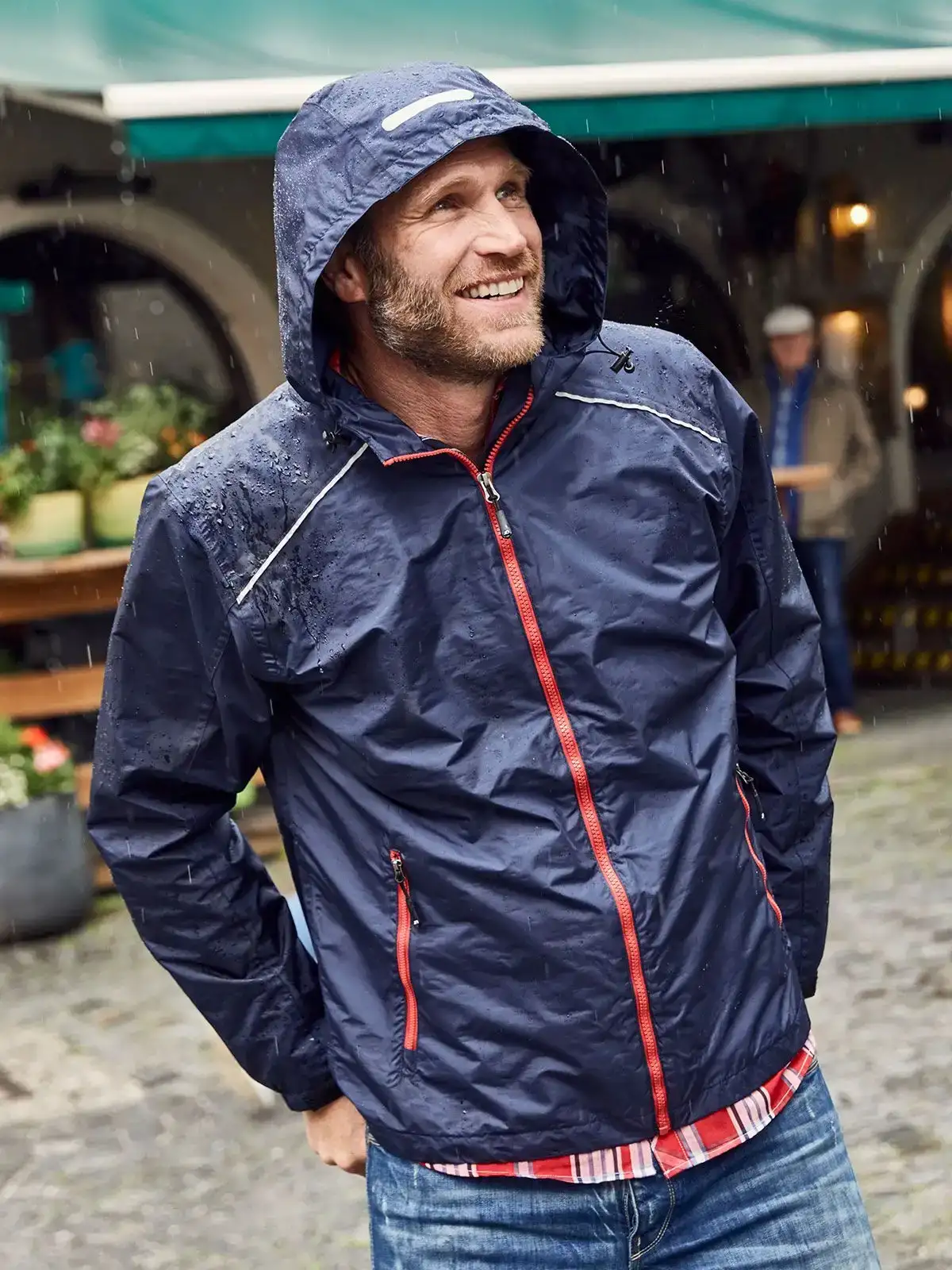 100% poliestere. Giacca da pioggia, casual e funzionale, Tessuto funzionale a 3 strati con membrana TPU. Antivento e idrorepellente (colonna d'acqua 3.000 mm), traspirante e permeabile al vapore (1,500g/m²/24 h), Cuciture nastrate, Zip a contrasto, Zip frontale a scomparsa con protezione per il mento, Cappuccio regolabile con cordino elastico, 2 tasche laterali con zip, Tasca interna, Dettagli riflettenti sul cappuccio e nelle parti frontali e posteriori, Zip per la decorazione sul retro. Tessuto esterno: 100% poliestere, Fodera: 100% poliestere, Velcro, Manica lunga, Fodera in rete, Cuciture sigillate, Colonna d'acqua 3.000 mm