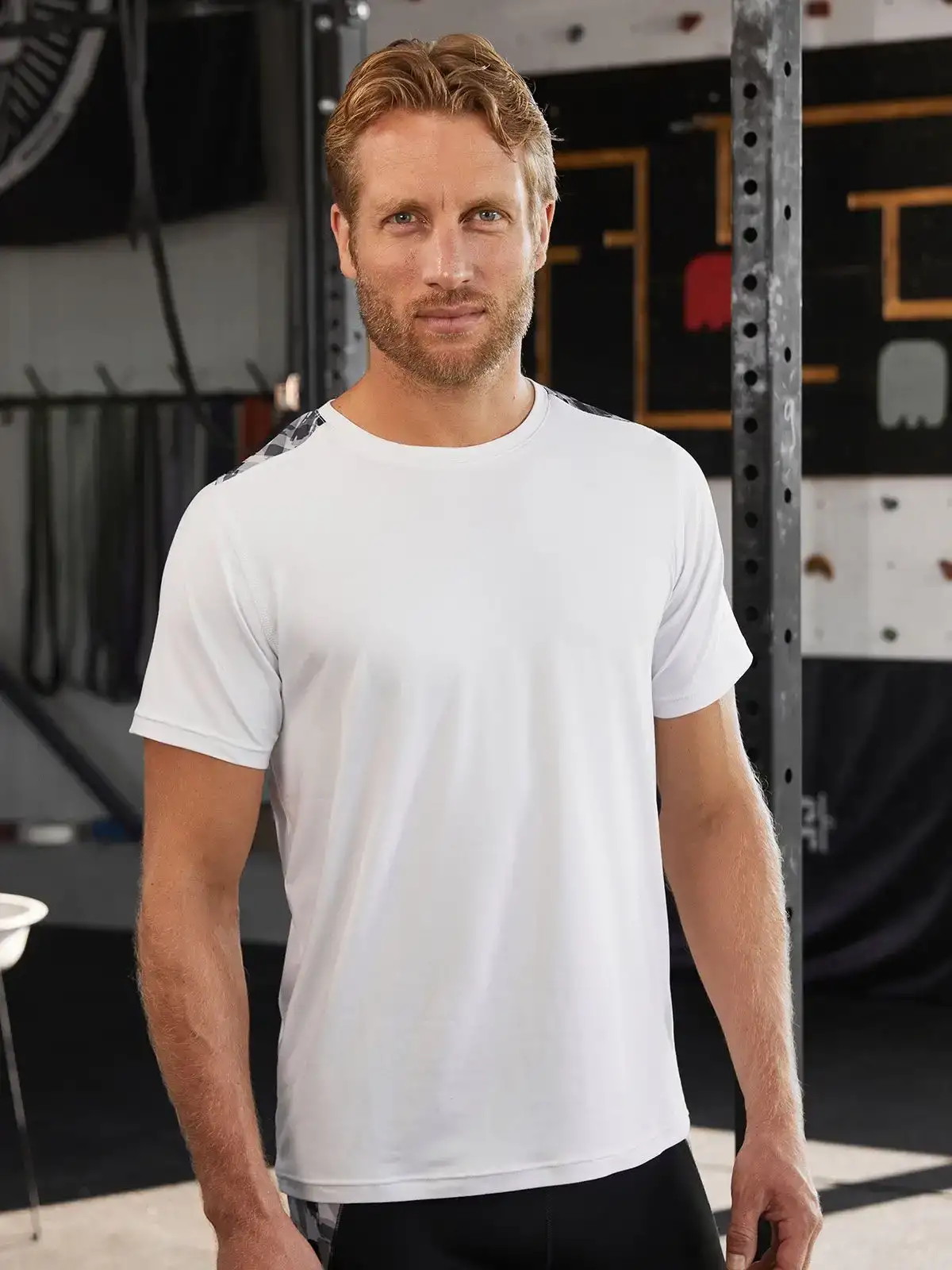 92% poliestere riciclato 8% elastan (tessuto esterno 1), 100% poliestere riciclato (tessuto esterno 2). T-shirt sportiva traspirante e con regolazione umidità, asciugatura rapida, leggera e confortevole, maniche raglan, collo rotondo, stampa all-over sulle spalle (fronte e retro).