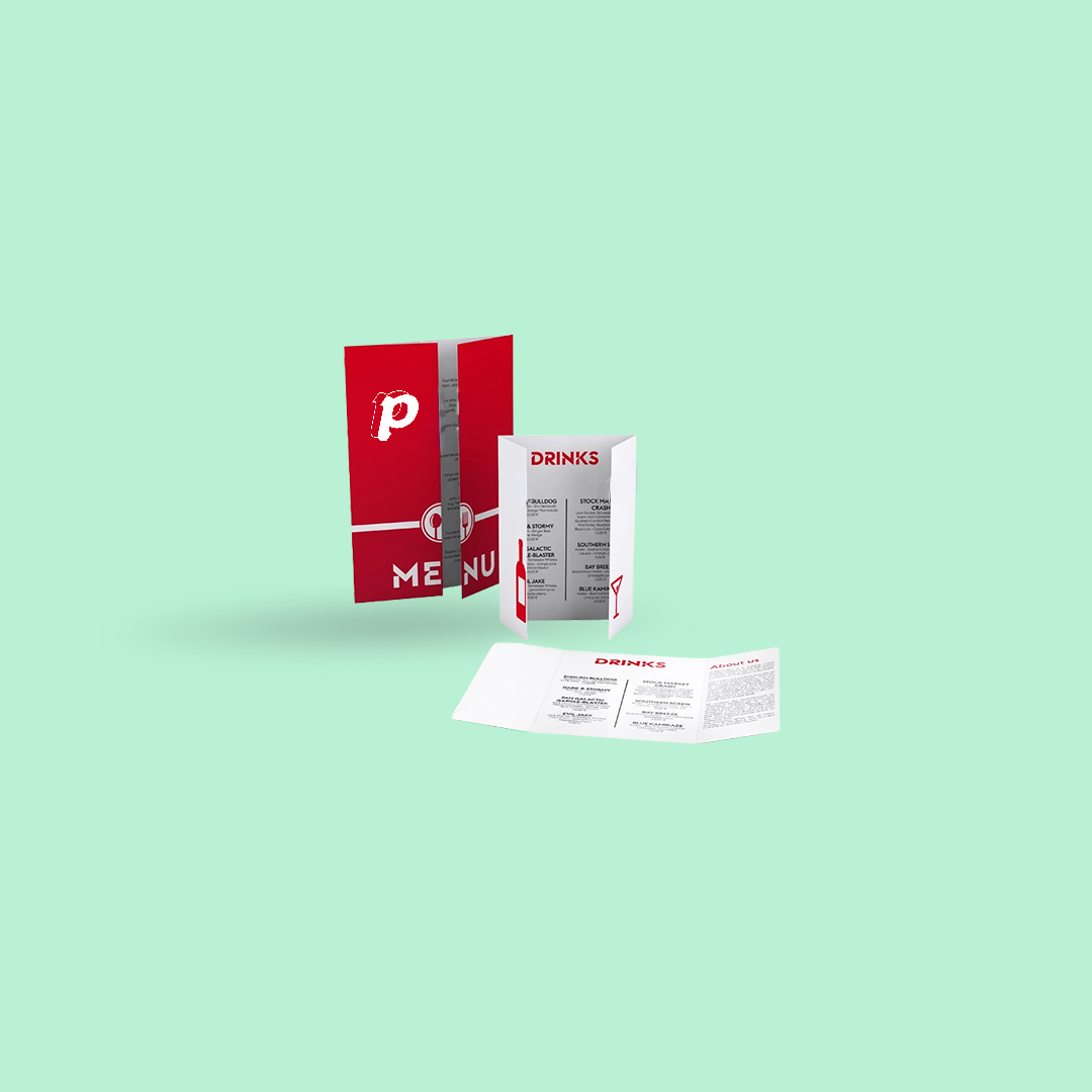 Sui tavolini e sul bancone o distribuiti agli ospiti dai camerieri, questi menu con 2 pieghe a finestra risvegliano l’appetito, presentando l’offerta gastronomica di bar, gelaterie o come carta della colazione in hotel. Il nostro consiglio: fai stampare la tua offerta di piatti e bevande sulle pagine interne e riserva l’esterno apribile al logo della tua attività. Dessert e aperitivi trovano spazio sul retro. In questo modo puoi sfruttare al meglio ogni angolo delle 2 pieghe a finestra.6 facciatetanti formati diversi300 g carta patinata opacaa partire da 100 esemplariInformazioni obbligatorie:Informazioni sul produttore / responsabile