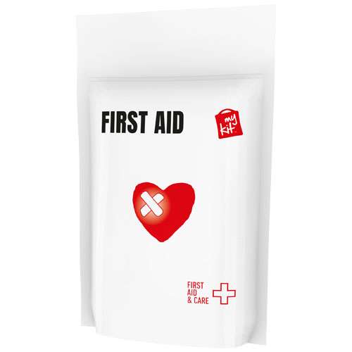 Il kit di primo soccorso compatto ideale. Le dimensioni di questo kit consentono di portarlo sempre con voi. Con questo kit sarete preparati per i piccoli incidenti. Contenuto: 5 cerotti resistenti all'acqua, 2 salviettine disinfettanti. Tutti i prodotti contenuti nei MyKit rispettano le norme Europee vigenti. I prezzi includono stampa all-over fronte e retro. Fornito in una custodia di carta.