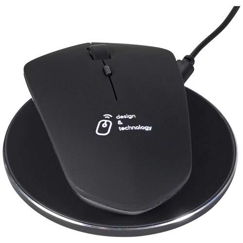 Mouse e base per mouse per ricarica wireless a induzione da 10 W utilizzabile sia in viaggio che in ufficio grazie alla prolunga di 30 cm (realizzata in RPET). Brevetto EUIPO EUROPA.