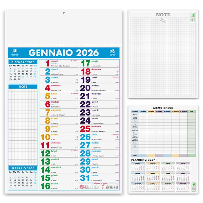 Edizione 2026 ; olandese mensile 12 fogli ; carta patinata 70 gr. ; testata termosaldata ; festività internazionali ; pagina note stampata sul retro ; memo spese in ultima pagina ; tecnica di stampa consigliata: adesivo digitale - serigrafica