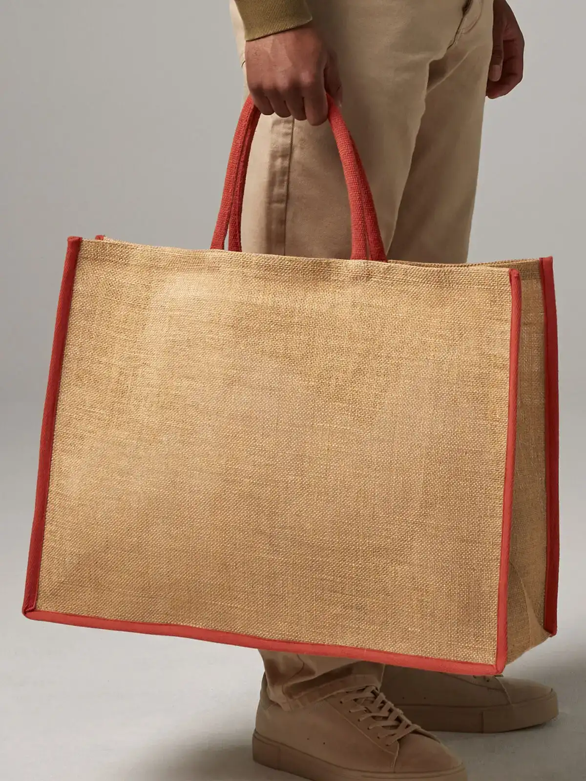 100% Juta. Shopper con manici in cotone, ampia capienza, lunghezza del manico: 47,5cm. Dimensioni: 42,5x55.5x21cm. Capacità: 46 litri. Area di stampa: 50x36cm.