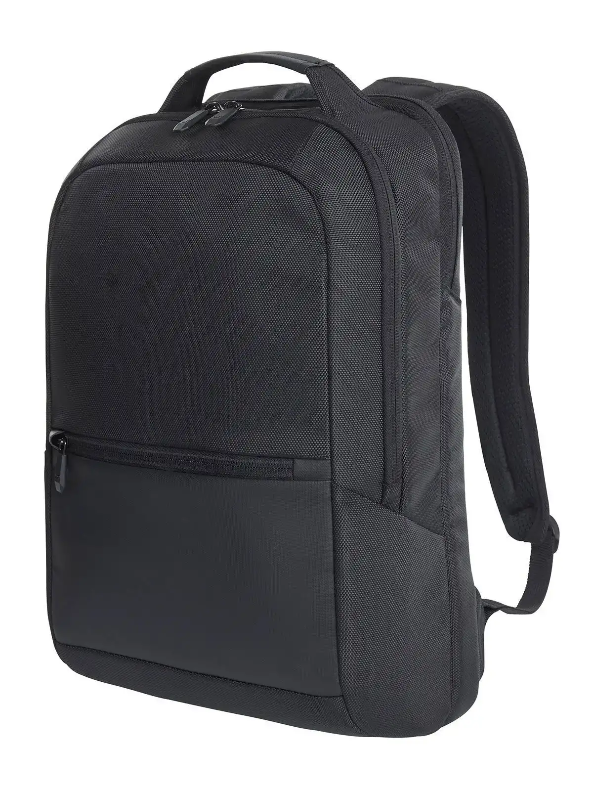 100% poliestere. Zaino lineare, tasca a inserto imbottita e scomparto a rete con chiusura lampo, ampio scomparto per notebook con accesso separato, passaggio per cavi fino allo scomparto principale, tasca anteriore con chiusura lampo, retro imbottito, passante per fissaggio all' asta del trolley, spallacci imbottiti e regolabili, manico rinforzato. Dimensioni: 30x45x15 cm. Area personalizzabile: frontale 18x11 cm.