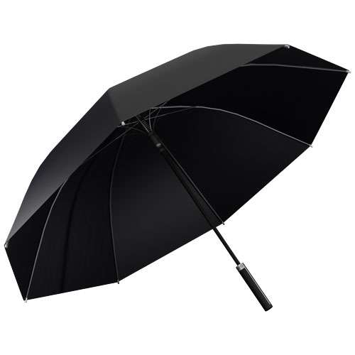Ombrello da golf realizzato con pongee in rPET 210T e struttura in fibra di vetro. Impugnatura morbida con pulsante integrato per un'apertura rapida. Sistema antivento per una migliore resistenza al vento grazie al telaio flessibile. Prodotto personalizzabile sull'esclusiva targhetta metallica con bottoni. Fornito con una custodia per ombrello e consegnato in una confezione regalo cilindrica in carta riciclata (96 x 5,5 cm).