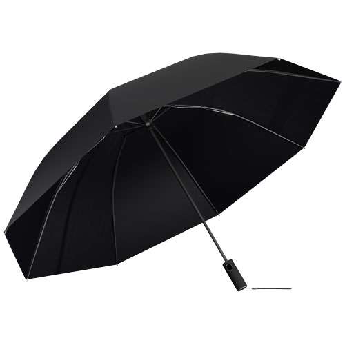 Ombrello semiautomatico pieghevole realizzato in pongee rPET 210T con struttura in fibra di vetro. Impugnatura morbida con pulsante integrato per una rapida apertura e chiusura. Sistema antivento per una migliore resistenza alle intemperie grazie al telaio flessibile. Prodotto personalizzabile sull'esclusiva targhetta metallica con bottoni. Fornito con una custodia per ombrello e consegnato in una confezione regalo cilindrica in carta riciclata (32 x 6,5 cm).