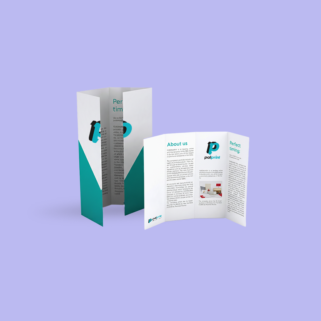 I pieghevoli con 3 pieghe a finestra si aprono a sinistra e a destra come una finestra e liberano la vista dei tuoi prodotti. Con materiali o rifiniture esclusive darai ai tuoi pieghevoli un tocco in più.formato finale chiuso: DIN lungo, DIN A4, DIN A5 e tanti altri formati8 facciatediversi materiali come carte offset, riciclate e patinatepossibilità di rifinituraa partire da 10 esemplari Lade Video ... Nota: a seconda della configurazione con certificazione FSC® o PEFC Ulteriori informazioni su FSC® o PEFC (Codici di licenza: FSC-C155353 / PEFC/04-31-3266).Informazioni obbligatorie:Informazioni sul produttore / responsabile