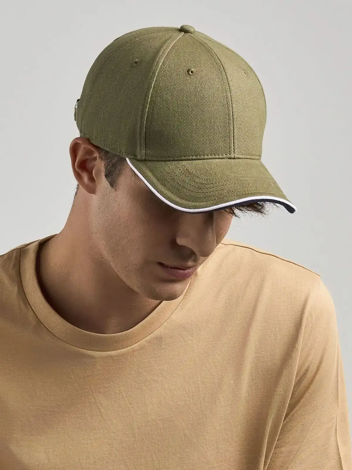80% cotone organico 20% cotone riciclato. Cappello a 6 pannelli in cotone twill spazzolato effetto pesca, pannelli frontali strutturati, interno della visiera in plastica riciclata, chiusura con fibbia di metallo, piping a contrasto sulla visiera e sulla chiusura.