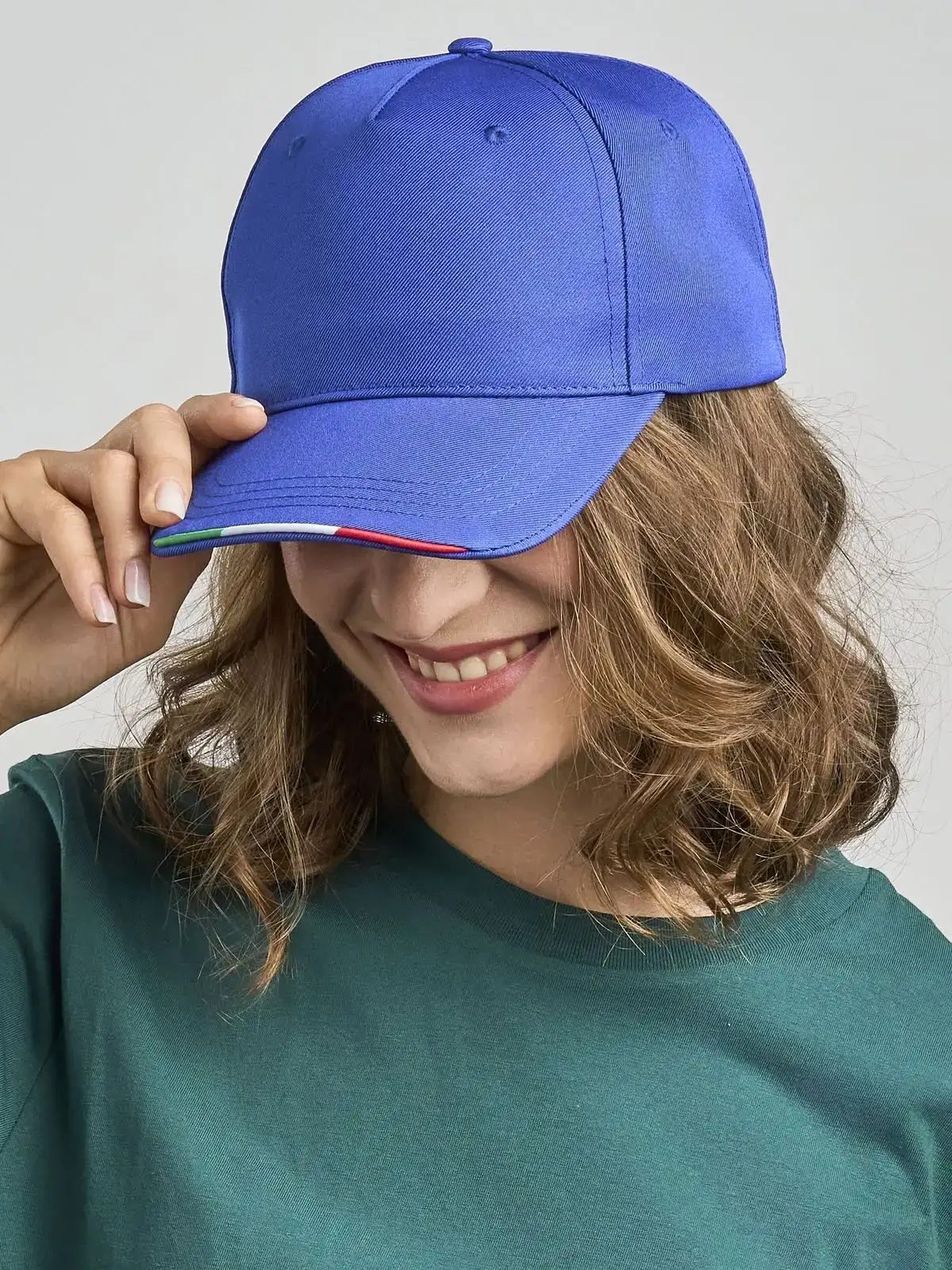 100% poliestere riciclato. Cappello a 5 pannelli con profilo a contrasto nella visiera, coi colori della bandiera italiana.