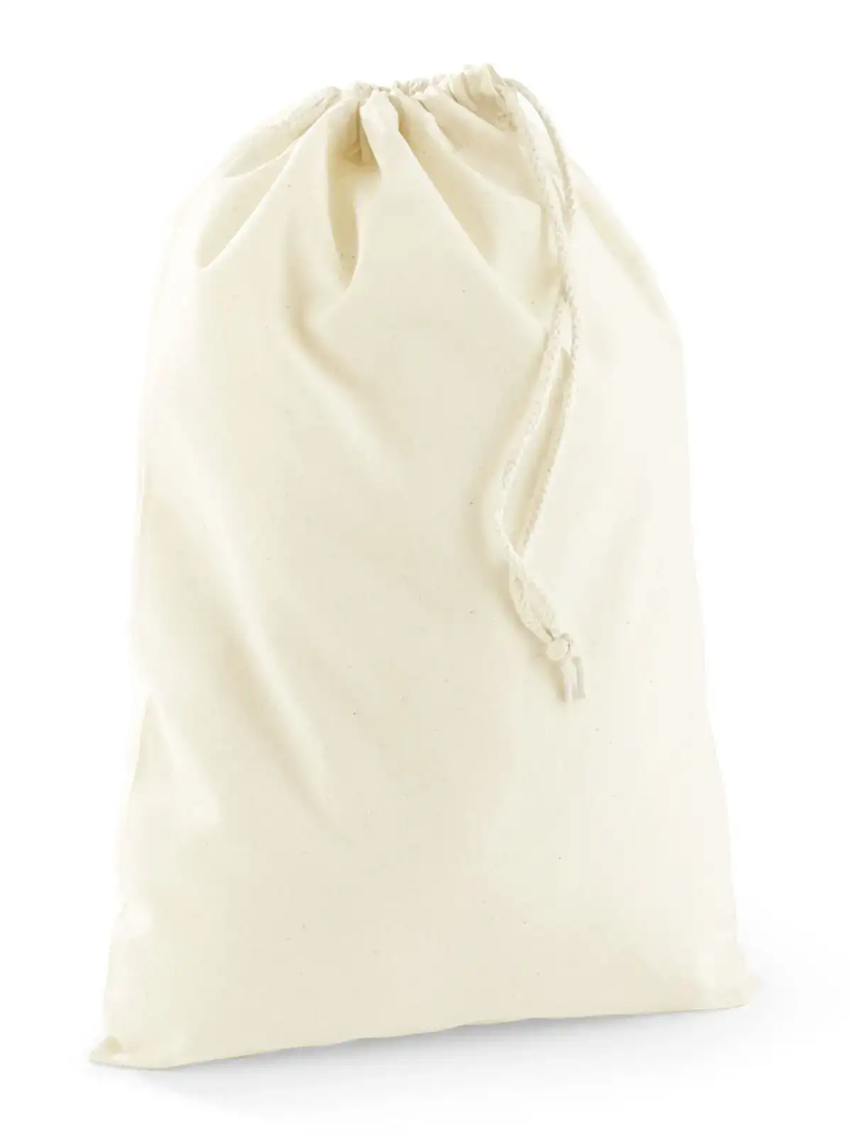100% cotone riciclato. Sacchetto in cotone riciclato GRS, certificato da Control Union CU811033 con cordini in cotone riciclato. Etichetta removibile. Dimensioni: XXS: 10x15 cm, cap. 0,25 lt. - XS: 14x20 cm, cap. 1 lt. - S: 25x30 cm, cap. 3 lt. - M: 30x45 cm, cap. 8 lt. - L: 40x50 cm, cap. 14 lt. - XL: 49x75 cm, cap. 38 lt.