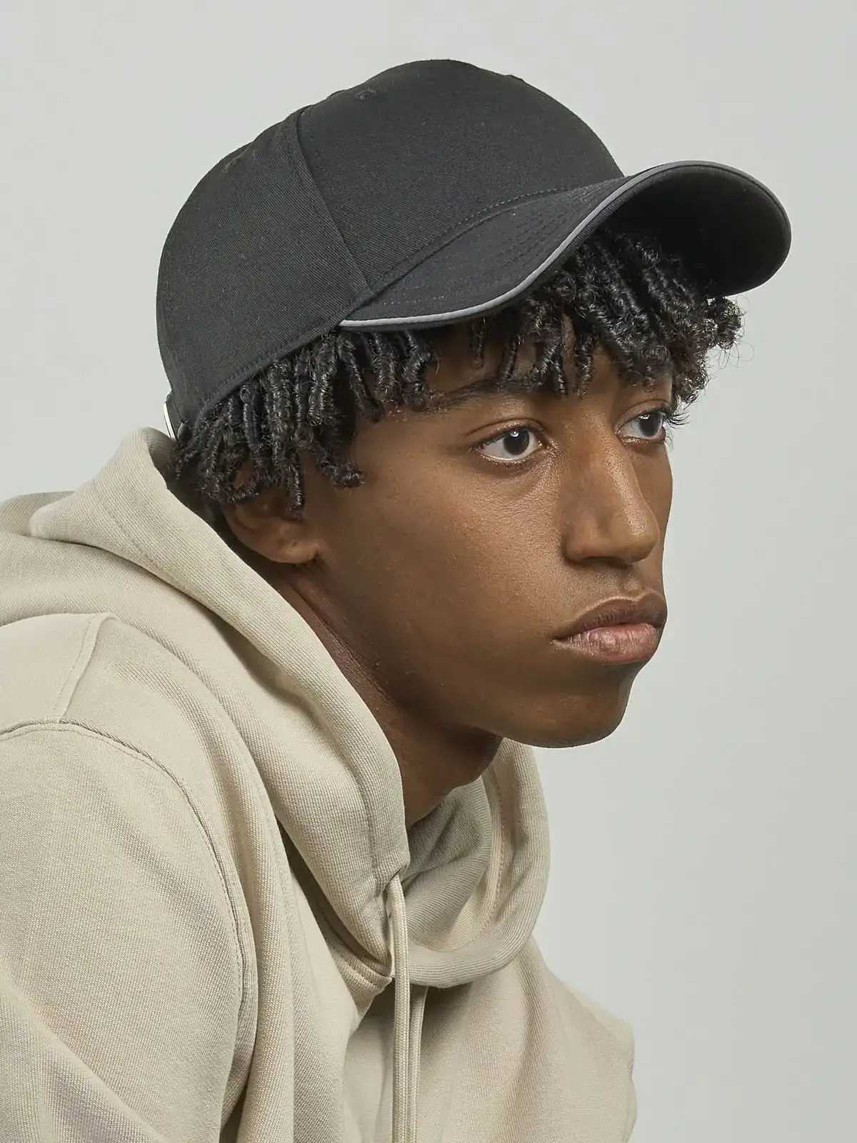 65% poliestere 35% cotone. Cappellino a 6 pannelli, occhielli ricamati, piping riflettente sulla visiera e sulla chiusura, pannello frontale rinforzato, visiera pre-curvata, chiusura con fibbia e foro cucito, 6 cuciture su visiera, parasudore: 35% cotone - 65% poliestere. Etichetta removibile.