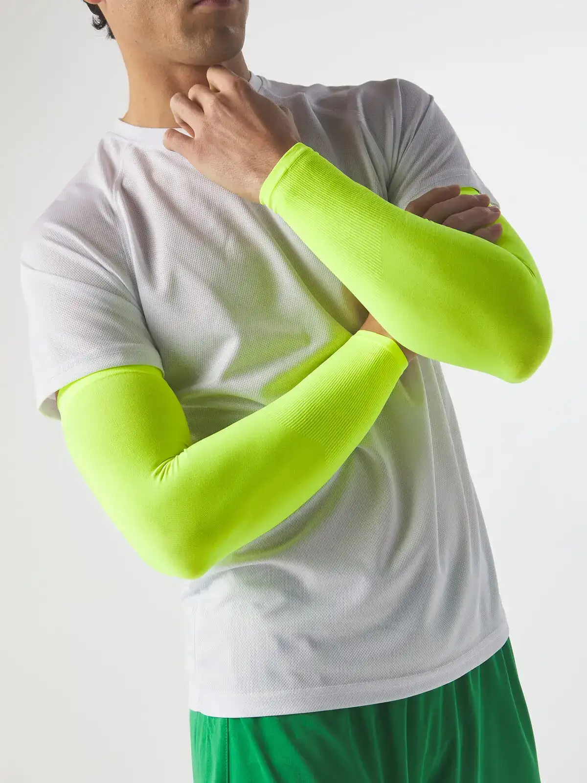 90% poliestere, 10% elastane. Coppia di manicotti adatti allo sport, fattore di protezione solare 40+, inserita in pratica bustina (etichetta applicata sulla busta).