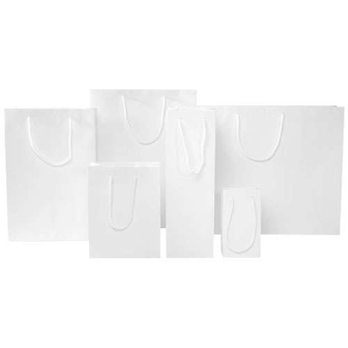 Sacchetto extra large di carta integra da 170 g/m² opaca (31 x 12 x 41 cm) realizzato a mano con manici di plastica. La parte anteriore e posteriore personalizzabili offrono un ampio spazio per stampare un logo o qualsiasi altro design, rendendolo un ottimo strumento di marketing aziendale. Realizzata in Europa e riciclabile al 100%.