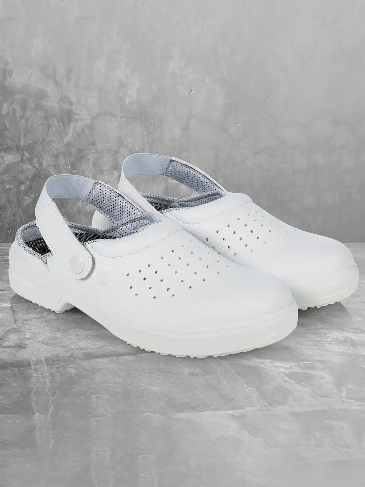 Tessuto esterno: 100% sintetico. Scarpa di sicurezza Oxford. Con puntale in acciaio, resistente agli urti: fino a 200 Joule, parte del tallone aperta, bottone a pressione removibile, vestibilità comoda, traspirante, fodera antibatterica permanente, sottosuola in PE, suola in PU antistatico, sntiscivolo, resistente a oli e combustibili, ammortizzazione ad alta energia sul tallone, lavabile fino a 40°C. EN ISO 20345:2011, SB-E-A-FO-SRC. Taglie: 35 - 47.