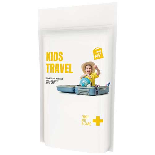Set da viaggio per bambini con tutto il necessario per la prima cura delle ferite e braccialetti antinausea per ridurre i disturbi causati dai viaggi. Contenuto: 12 cerotti per bambini, 2 salviette rinfrescanti e 2 braccialetti antinausea da viaggio. Tutti i prodotti del kit per il pronto soccorso e per la cura del corpo sono conformi a tutte le normative UE vigenti. Prezzo incluso della stampa a colori. Forniti in una confezione di carta.