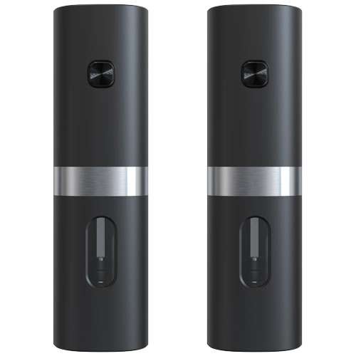 Set macina pepe e sale elettrico con luce a LED blu che si illumina all'accensione per controllare la fuoriuscita di sale/pepe. Ogni macinino (17,8 x 5,1 cm) è dotato di una batteria, ricaricabile direttamente sulla base. La base può anche essere personalizzata con un logo luminoso. Entrambi i macinini sono dotati di un serbatoio trasparente per distinguere facilmente il contenuto all'interno e possono essere utilizzati circa 200 volte con una sola ricarica. Forniti con una base di ricarica (15,5 x 8 x 2,5 cm) con finitura in gomma soft-touch. Con confezione regalo in carta kraft riciclata (17,7 x 23,4 x 8,5 cm). Garanzia di 3 anni inclusa.