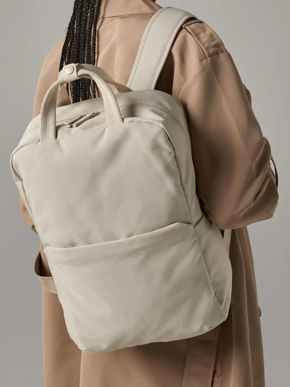 100% poliestere riciclato. Zaino per laptop fino a 16'' in poliestere riciclato certificato GRS, tessuto idrorepellente, tasche interne posteriori a scomparsa, ampio scomparto principale, tasche frontali con zip, tasca posteriore di sicurezza con cerniera, cinghia posteriore per bagaglio, spallacci imbottiti e regolabili. Dimensioni: 41x37x11 cm, Capacità: 16 litri, Tasca frontale: 18cm. Etichetta strappabile.