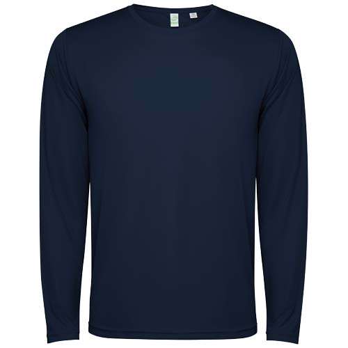 T-shirt tecnica da bambino a maniche lunghe. Collo con cuciture abbinate. Orlo posteriore leggermente più lungo di quello anteriore. Cuciture laterali spostate in avanti.